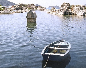 帰り道、眺めの良いカフェで、靴を脱いで絨毯を敷き詰めたテラスで寛ぐのも良い[写真5]。港の岩陰の海の中に、リキアの石棺が一つ浮かんでいる[写真6]。度重なる地震で地盤沈下して土台が海中に沈んでしまったものであろう。ぜひ対岸のケコヴァ島まで足を伸ばして水中遺跡を探勝してみたい。