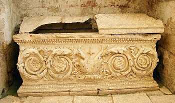 教会は5〜6世紀のバジリカをベースに原型が分からぬまでに再建・増築を繰り返されているが、荒廃の程度もひどく、整備が進められている。色褪せたフレスコ画やモザイクが往時を偲ばせる[写真1]。アギオス・ニコラオスの棺[写真2]には現在何も入っていない。その後、指など幾つかの骨の破片が残っているのが発見され、現在アンタルヤ博物館に保管されている。 |