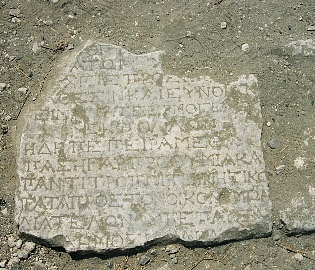 そのひとつひとつの石の切り口や彫刻は、文化財といえるレベルのもので、それらが無造作に散乱している様子にこの地域の奥深さが感じられる[写真7]。現代の観光客も踏んで通る入口の敷石には、はっきりとギリシア文字が刻まれていた[写真6]。