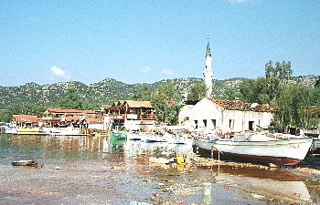 のように静かなシメナ湾。地中海から島影で遮られた海だ。航路からも外れ、現代の動脈である国道からも外れた、忘れ去られたような静かな漁村がウチャウズだ。開発が制限されているので、小さなモスクの塔以外は民家が点在するだけだ。周辺には古代リキアの遺跡が数多く、ケコヴァ、シメナを始めとして船をチャーターしての探勝のベースに最適だ。実際、小村落にしては立派な港には、たくさんの小船が停泊しており、頼めばいつでも船を出してくれる[写真1]。