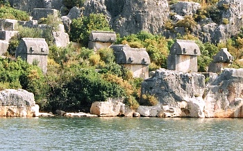 ウチャウズそのものも、紀元前5世紀に遡る古代リキアの町ティミウッサ(Teimiussa)である。町の東方の木々に覆われた海岸線に当時のネクロポリス(墓所)があり、リキア式石棺が林立する様は壮観だ[写真2]。 |