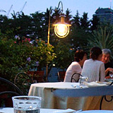 | ゆったりとして木々に囲まれたテラス | イタリアのリストランテを髣髴とさせる洒落たテーブル |
