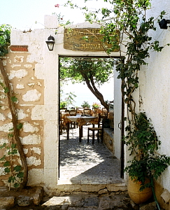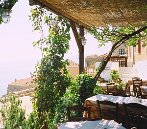 他にも手作りパスタのヒロピテス、新鮮な魚のグリルを初め、お勧め料理には事欠かない。 中世の数百年間の繁栄、住む人も疎らだった20世紀、そして観光都市として復興して賑わう今日の姿。変化に富んだ町の様子に比べ、テラスでぼんやりと眺めるモネンヴァシア沖の静かなミルトー海は、このレストランのレシピと共に、何もなかったかのように変わっていないのであろう。そんなことを思いながら、木漏れ日の下、よく冷えた地元産の白ワインを手にまどろむのも楽しい。 |