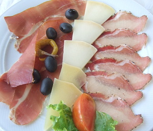 元の食材から作られる料理は、すべて山のものだ。前菜には、地元のプルシュト(プロシュート─生ハム)、羊のチーズ、またさすがこの地の特産だけのことはあり、チーズのトリュフ掛けという贅沢なメニューもある。