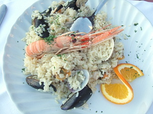 次の一皿は、海の幸のリゾットだ。パスタ(麺類)ほどではないが、クロアチア東部の海沿いではリゾットのメニューが目立つ。しっかり効いた魚の出しで炊き込んだ米の間に、手長エビ、小エビ、ムール貝、アサリがたっぷり。日本国内でも食べられる決して珍しいメニューではないが、これだけ新鮮な素材をたっぷり使ったリゾットは、コスト重視の日本の店ではとても味わうことはできない。
