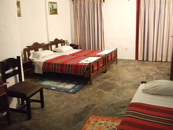 玄関の分厚い木の扉を開くと、室内は漆喰の白壁で、床には平たい石が敷き詰められている。田舎風の木製のベッドや調度品が、民族調のタペストリーと共に温かみをかもし出す。 初めて来たのに、懐かしい場所に帰ってきたような、ほっとした気分になる。 |