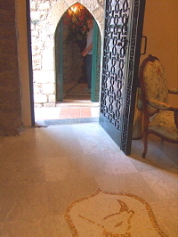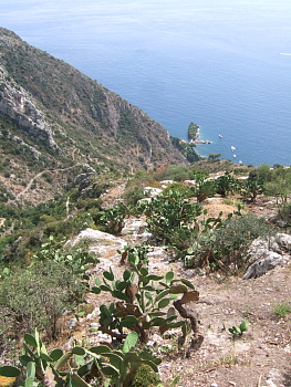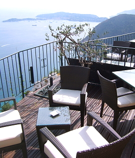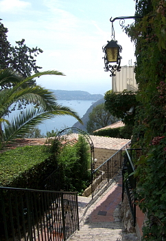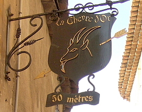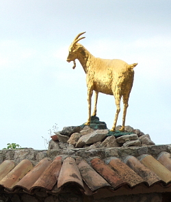エズを訪れたバロコーヴッチが、金色の毛の山羊に導かれて進んで行くと、この建物に辿りついた、と伝えられている。かつて、このあたりの岩山では山羊が放牧されていた。実際、ホテル南面は山羊が遊ぶのにちょうど良い斜面になっている。南から逆光を浴びて金色に輝く、ヤギの神秘的な美しさに惹かれてついて行ったのだろう。