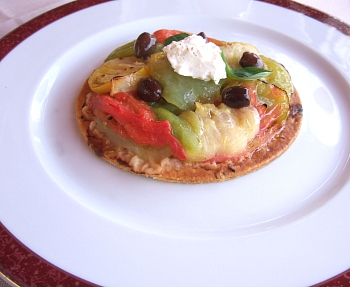 アミューズブッシュは、薄焼きパイの上に、トマト、パプリカ、レタス(?)ポテト、などをあしらい、黒オリーブ、ヤギのチーズ、バジルをトッピングした、食べ応えある一品。やや酸味のある煮汁のソースが、パイと野菜を調和させ、それぞれの食感を感じながらも一体感のあるおいしさを引き出している。