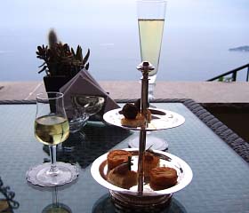 黄昏のテラスでシャンパンとアミューズブッシュを