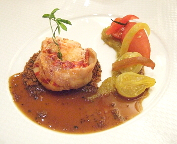 前菜三皿目も、凝った造りの料理だ。詳しくは思い出せないが、ポテト、ベーコンなどを組み合わせて作った容器にグラタンが入っているものだったかと思う。トマトと、ナス科野菜の一種だろうか、品のいい温野菜が添えられていた。