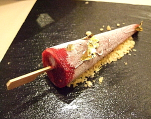 最後に、金粉と紛糖で飾ったパラソル型のカシスのアイスキャンデーで、このディナーコースも終わりを迎える。