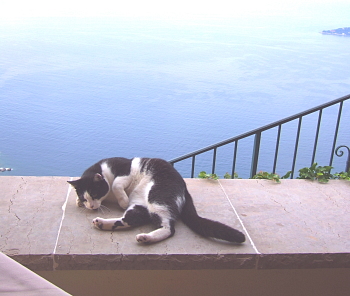 スイートなら海の見えるルームテラスでの食事も良いが、そうでもなければ昼食と同じ絶景のテラスでの食事がよい。 外来客がいない静かなテラスは、朝の涼しさも相まって、昼とは違った雰囲気だ。 ランチの時は肩身の狭そうだったのに今や自分の庭のように自由に歩いているホテルの飼い猫と遊んだり、手持ちぶさたなスタッフとのんびり会話したり、一番アットホームな食事タイムといえるかも知れない。