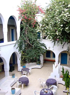 チュニジア風の装飾が見事な水色の立派な木戸をくぐった、建物の中をくり貫いたトンネル状の部分が受付になっている。そこを抜けると目の前は石を敷き詰めた長方形の中庭だ。 四辺には、中庭を見下ろすように2層に宿の各部屋のドアが配置されている。街の喧騒からは想像できない静かな落ち着いたスペースだ。毎朝、夏のまだ涼しい時間に、ブーゲンビリアの花に囲まれたオープンエアのこの場所で取る朝食は気持ちいい。