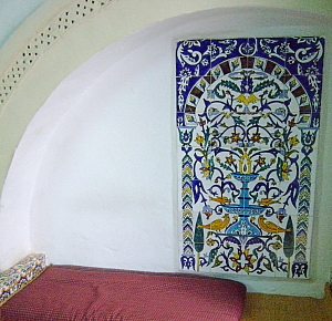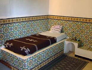 室入口に面した四角い廊下は、美しいチュニジアンタイルで飾られており、修道院の中庭の眺めを思い起こさせるような光景だ。水色のドアを開いて、その昔、商人たちが泊まったであろう一室に踏み入れる。