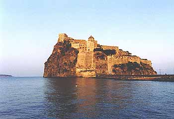 泉の湧く保養地として名高いイスキア島。その200mほど脇の海上に寄り添って浮かぶ岩山の山頂に、当時ギリシア人領であったシチリア島のシラクーザのゲローネ(Gerone)1世によって紀元前474年初めて要塞が建設された。1438年、アラゴン朝のアルフォンソ5世は要塞を再建し、島を橋で繋いだ。 |