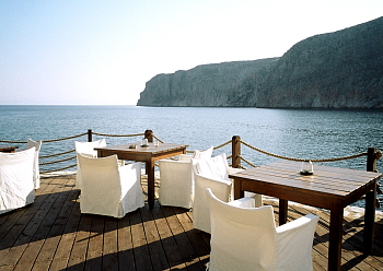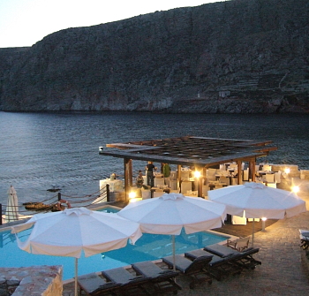 の青色が、少しずつ紫がかってくると夕暮れが近い。倉庫一棟を改装したディナーのための立派なホールがあるが、夏ならばプールから続いて湾に向かってせり出したロマンチックなウッドテラスでのディナーが最高だ。