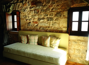 石壁のゲートを抜けた後、陽射しを白一色の石材が反射する白い光の世界から、一転して暗やみの中に通される。初めは回りの様子が全くわからないが、目が慣れてくると古びてはいるが落ち着いたレセプションであることが分かる。この一角には、大邸宅のようなロビーと、倉庫をそのまま使っているであろう画廊がある。マーニ特有の乾燥した大地の村々を描いたプリント画なら、手軽に入手できる。 |