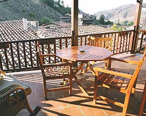 泊まるならぜひスイートをお勧めする。ドアを開けると立派なシステムキッチンを備えた落ち着いた食堂、そして次がクラシックなインテリアのリビング、さらにベッドルームは天蓋つきの素敵なベッドとアンティークの箪笥、衣装箱がある。しかし一番のくつろぎの場所はなんと言ってもロッキングチェアと木のテーブルがある広いテラスだ。古い瓦屋根の町並みや山々の眺めが美しい。何があるわけではないが、のんびりした空気とアンティーク家具に囲まれ、それでいて設備がしっかり整っている贅沢な時間を過ごすことが出来る。