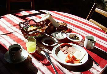 夏とはいえ肌寒い朝の空気のなかでも、木の温もりいっぱいのパティオの陽だまりのやわらかい日差しの中でならくつろいだ時間を過ごすことができる。 | ||||||