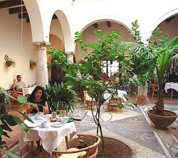 ラスや川側の部屋からは断崖上に建ち並ぶサンタ・マリア、サン・ペドロの両教会を望み、反対側の部屋からは市庁舎と町のテラスを見下ろすことができる。決して古城のような壮大な建物ではないが、小さなパティオを持ったこじんまりした心地よい宿だ。木製の梁や柱とブルーのイスラム風のタイルに特徴付けられるインテリアに安らぎが感じられる。レストランでは、pescaitos fritos(小魚のフリット)、やrabo de toro(オックステール)などの郷土料理が楽しめる。