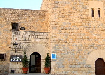 ようやく麓に到達すれば、あとはエンジンをふかして舗装された山道を一路登っていく。 ゲートをくぐった山頂は、砦の一部と見まがうような、パラドールの建物だ。 実は20世紀後半の新しい建物なのだが、景観保護とデザイン性とを考え、城壁と全く同じ作りで建築されているので、その重厚感は中世の城と何ら変わらない。