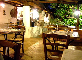 映画「イル・ポスティーノ」の舞台となった村、ポッラーラへは、この村との間を往復する乗合バスで10分ほどだ。 海と山の青さが闇に溶け込むと、ホテルのテラスはこの村一番のレストランに早変わりする。白い壁と年月を経た太い木の柱が明かりに照らされて、涼しい風が通るのに温かみのある空間となる。 料理は、いかにもシニュウムらしい、素材を活かした飾り気のないリチェッタ(レシピ)だ。名を知られた料理人の特別な一皿というわけでもなく、今日一日の疲れを取り、明日の滋養を養うために、肩の力を抜いて味わいたい。 カジキマグロのカルパッチョ、パスタ、魚介のグリル盛り合わせ、ピスタチオのケーキが手際よく運ばれてくる。