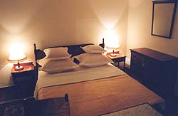 チ ェックインを済ませ、ホテルマンについて村の中を進んでいく。ある一軒の白っぽい石造りの家の前で足が止まった。スタンダードルームなので二階建ての大きな家を仕切って4室に分けている。ここが今日泊まる部屋だ。広さには余裕があり、アンティークの家具が暖かい感じだ。窓からはビーチや本土の山の景色が美しい。バスルームもゆったりとしている。
