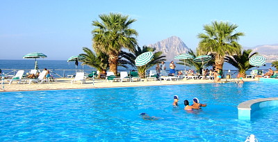 もっと大きなビーチで過ごすなら、ここから車で1時間弱の、サンビート・ロ・カーポの砂浜がいい。どこまでも続く白砂の美しさは、シチリア一といわれている。 またホテルの真上の山上都市エリチェの観光や、トラーパニの市内や塩田など、近くの見所を巡るのも良いだろう。 |
