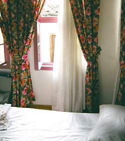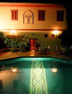 高台の一番海側、港への下り口に位置するのが、このホテルだ。城壁に沿った幾つかの建物全体でホテルとして機能している。城壁を背にしたレセプションの建物で手続きを済ませて、城壁沿いに宿泊棟へと進んでいく。城壁をくぐった右手は誰でも利用できるカフェになっていて、昼には青い海を眺めるカフェで、夜には港の夜景を眺めながらグラスを傾けるバーになる、市内でも人気のスポットだ。 蔦の這う城壁に擁かれたイスラム風デザインのプールの向こうに客室がある。年期の入った懐かしい木造建築をベースに、ピンクを基調にしたトルコ風のインテリアと調度品が備え付けられている。