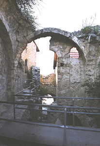 数分の登りで中の部分に着く。ここは王宮の実質的に下半分で、居室の他に、礼拝堂、井戸などが揃っている。 テラスからのキレニアの海岸線の眺めが素晴らしく、木陰にカフェがあるので思わず一休みしたくなるところだ。 この先はそそり立つ岩峰を縫うようにつけられた階段やはしごを上っていく、まるで登山道のような道となり、年配の見学者はかなり苦労するところだ。 十分ほど喘ぎながら急傾斜を登り切ると、ごつごつした稜線の上に出る。