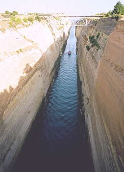 都市機能は、新たに建設された現在の新市街に移り、遺跡として旧市街の発掘が開始された。しかし近代まで現役の都市であったことが災いし、目ぼしいモニュメントは、他の有名な遺跡に比べ、ペイレーネの泉、アポロン神殿などわずかしか残っていない。 遺跡のある台地からポコッと盛り上がった巨大な岩山の上の城塞、アクロコリンソスが、現存する主要な見所だ。古代のアクロポリスだったところで、中世には城塞として使われていたところだ。頂上からの眺めは素晴らしい。 全長約6300メートルのコリンソス運河が、エーゲ海とコリンシア湾とを繋いでいる。紀元前から構想はあり、西暦67年には工事が開始された。何回か着手されたが、政変や資金難で完成には至らず、完成したのは1893年のことである。運河は狭く、大型船の航行はできないが、道路橋の上からはタグボートに引かれて80メートル下を航行する船を覗き込むことができる。 |