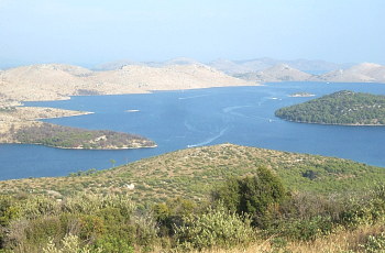 車を1kmちょっと走らすと、ようやくマグロヴィッツァ(Magrovica)浜の水辺が見えてくる。さらに4〜5km走るとグルバシュチャック(Grpaćak)だ。標高146Mの山頂は電波施設があり、360℃の素晴らしい展望だ。細い岬上に突き出た地形の上にあり、海側はこの付近で最大規模の百数十メートルの崖となって落ち込み、反対側は幾何学的に入り組んだ海岸線になっている。ドゥギ島から続くコルナティ諸島の、白い円錐型の島々の連なりが面白い。