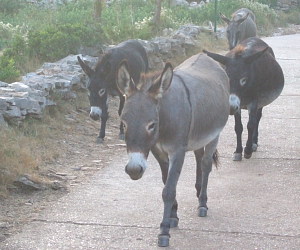 自然公園の中心へは、自然保護のため一般車は入れない。ゲート前に車を置き、入江沿いの涼しい松林を歩いて進む。放し飼いのロバが三々五々通っていくのを見て、昔の島の様子もこうだったのかと想像する。