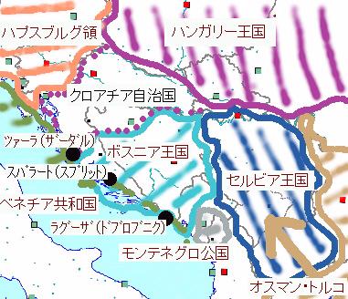 西暦1391年ボスニア王国の消滅、モンテネグロ(ツルナゴーラ)の建国、トルコの進出とセルビアの衰退1391年、ボスニア王トゥブルトコが死ぬと、国内にボゴミール派、カトリック、正教徒の反目がおき、その後しばらく形式的に王国は存在するものの、またたく間に国内は諸侯や周辺諸国に事実上分割された。 ダルマチアは、ボスニア王の死後、北部沿岸を除き内陸部までベネチア共和国がほぼ掌握する。これ以後1600年頃までの間ベネチアは発展しギリシアからエーゲ海にかけて多くの領土を獲得する。 トルコはドゥシャン亡きあとのセルビアに攻め入り、1389年、今に語り継がれるコソボの戦いでセルビアを中心とするヨーロッパ連合軍は大敗を喫する。セルビアはギリシア、アルバニアの領土を失い、トルコの意向に従う属国になっていく。 南部の旧セルビア領にはモンテネグロ公国が建国された。険しい山岳地帯に位置するこの小国は、その地理的な特異性ゆえに激動の中世を耐え抜き、驚くべきことに今世紀初頭まで独立を維持するのである。 |