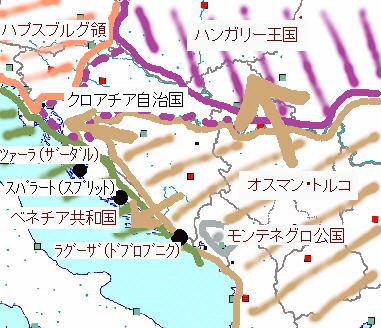 西暦1600年頃トルコ全盛時代オスマントルコは1526年モハッチの戦いでハンガリーを破り、ハンガリーは衰え始める。トルコはさらにハンガリーの大部分とクロアチアの一部を併合してハプスブルグ朝オーストリアの首都ウィーンをたびたび攻略するが占領できない。この時期トルコは現在のアルジェリアからエジプト、イラク、ロシアに至る地域をしめる大帝国に発展している。 セルビアではトルコの寛容な宗教政策のためもあり、1557年セルビア正教会が設立され、トルコ支配下に入った正教総本山からの宗教的独立を達成する。以後民族意識のよりどころとしての役割を果たす。 大部分をトルコに奪われたクロアチアはオーストリアに保護を求めその自治国となる。またトルコ国境にはオーストリアが雇い入れたセルビア人国境警備兵が住み着き、以後の民族問題の一因となる。 ダルマチアはベネチアがトルコと協定を結び安定して支配を続ける。ラグーザはトルコの保護下で自治を守る。トルコはボスニアのネウムとクロアチアのカルロバグでアドリア海への出口を確保する。 モンテネグロは首都のツェティニエをたびたびトルコに占領されるが何とか持ちこたえる。 ハプスブルグ朝オーストリア統治下のスロベニアではカトリックが再度盛り返し、プロテスタントは駆逐される。 |