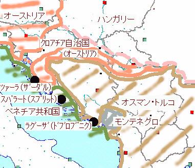 西暦1699年対トルコ戦でのオーストリアの反撃オーストリア軍は反撃に転じ1687年ハンガリーを、1688年セルビアをトルコから解放した。しかしカトリックであるオーストリア支配に対する正教徒であるセルビア人の反感からオーストリアはセルビアの地から撤退する。1699年のカルロバッツ条約で新国境が確定した。オーストリア軍に協力したセルビア人が難民となり周辺諸国に脱出する。 オーストリアはハンガリーを自治王国とし、またトルコとの国境は軍政を敷き直轄地とした。 ベネチアは衰え始めたトルコに戦いを挑み、ダルマチアからギリシアにかけての諸地域で勝利を収め、領土拡張に成功した。しかし海運国家であるベネチアや自治国ラグーザは喜望峰廻りの航路の発展により衰退を始める。 モンテネグロもトルコに対し勝利を収め、若干の拡大に成功する。 |